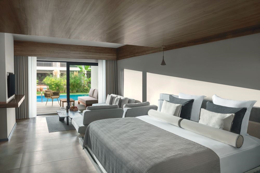 Familie swim-upsuite (2-3 pers. / 2 volw.+2 kind. / 3 volw.+1 kind) met terras met directe toegang tot het zwembad en zicht op het hinterland: 1 slaapkamer, 1 salon (type 25)