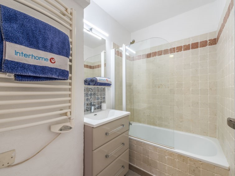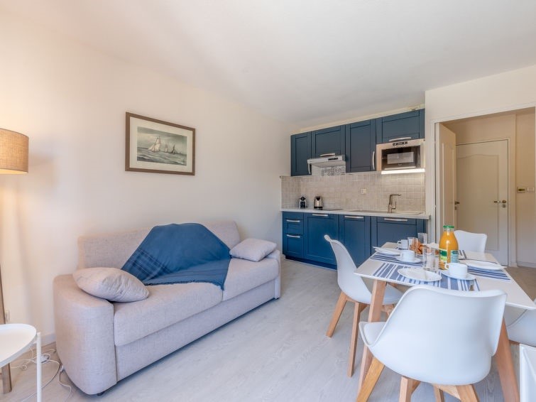 Appartement 2-kamers 35 m2 op de 1e verdieping, geschikt voor 2 volwassenen + 2 kinderen. Recent gerenoveerd en mooi ingericht met woon-/eetkamer met TV (Flatscreen TV) en air-conditioning. 1 kamer met 1 2-pers bed (160 cm, lengte 200 cm) en een slaapnis met 1 x 2 stapelbedden (90 cm, lengte 190 cm). Het appartement is voorzien van alle comfort en bevat een kookhoek (afwasmachine, 2 keramische glas kookplaten, broodrooster, waterkoker, magnetron, elektrische koffiemachine), badkamer, aparte WC en een groot balkon 12 m2 ingericht met balkonmeubilair en een uitzicht op het zwembad. Ter beschikking: strijkijzer, haardroger. Internet (Internet (WiFi), extra). Parkeerplaats.