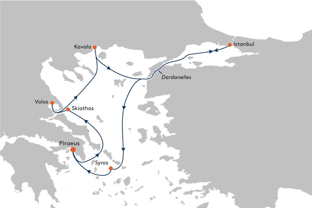 Zodra de EUROPA 2 de haven van Piraeus (Athene) heeft verlaten, neemt de verwachting naar het betoverende Skiathos toe. Het gelijknamige stadje op het heuvelachtige eiland nodigt uit om rond te slenteren en te genieten. Uw cruise gaat verder via de havenstad Volos, waar u de fascinerende Meteora-kloosters* op een spectaculaire locatie kunt verkennen, naar de ‘hemelsblauwe stad’ Kavala met zijn prachtige zandstranden en onverwacht charmante pleinen. De doorgang door de Dardanellen, de zeestraat die de Egeïsche Zee en de Zee van Marmara met elkaar verbindt, zorgt voor fantastische uitzichten voordat je uiteindelijk Istanbul bereikt, de bruisende metropool aan de Bosporus. Tijdens uw tweedaagse verblijf heeft u de keuze uit verschillende opties: bezoek de wereldberoemde moskee Hagia Sophia* en het Topkapi Paleis* of geniet van de zonsondergang aan boord van een jacht* voordat de EUROPA 2 het nog onbekende bereikt Cycladen-eiland Syros met zijn pastelkleurige huizen, klassieke villa’s en afgelegen stranden. De volgende dag eindigt uw cruise door de Egeïsche Zee in Piraeus (Athene), waar de EUROPA 2 afscheid van u neemt.