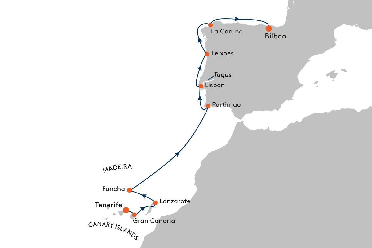 Geniet van een cruise* langs het adembenemende kraterlandschap van Gran Canaria naar Teror, een charmant stadje met prachtige historische huizen. In het hart van Lanzarote, waarvan driekwart bedekt is met lava, biedt het beroemde Timanfaya National Park*, ook wel bekend als de “Fire Mountains”, u spectaculaire inzichten in de vulkanische wereld van het eiland. De volgende dag nodigt het betoverende Madeira u uit voor een levada-wandeling* vanuit de hoofdstad Funchal langs het typische irrigatiesysteem door schilderachtige landschappen. Geniet van een ontspannende dag op zee terwijl de EUROPA 2 zijn cruise richting Portimao voortzet. Ervaar vanaf hier de fantastische panorama's van de Algarve* en het kleine havenstadje Lagos*, waarvan de winkels in de kronkelende steegjes zeker een bezoek waard zijn. In het levendige Lissabon brengt een tour* door de oude stad je naar de artistieke en trendy wijk Bairro Alto met zijn verrassende mix van geschiedenis en moderne kunst. Via Leixoes bereikt u Porto, dat u vanuit een spannend perspectief kunt verkennen met de historische tram uit het begin van de 20e eeuw*. Ten slotte brengt de EUROPA 2 u naar La Coruna, waar u de mogelijkheid heeft om te wandelen langs de laatste etappe van de Jacobsweg* voordat u Bilbao bereikt, de eindbestemmings van uw cruise.