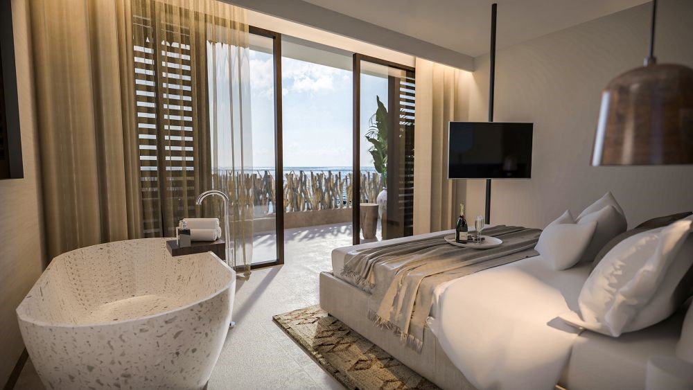 Beachfront Suite (1-2 pers., vanaf 16 jaar) (± 100 m2, kan verschillen per kamer) met open badkamer, badjas, slippers, ventilator, kingsize bed, sofabed (2 pers.), minibar (betalend), terras met dompelbad, dagelijks een gegarandeerd luxe loungebed in het VIP gedeelte van Cabana Beach (op naam gereserveerd en de gehele dag beschikbaar) (type 2)