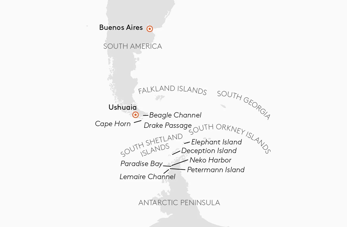 Je vaart zuidwaarts langs Kaap Hoorn, de beruchte rotsformatie waar oceaanreuzen zich eeuwenlang stukbeten op de wind. Dan volgt de oversteek van de Drake Passage. Een legendarische waterweg waar ontdekkingsreizigers als Shackleton en Amundsen hun koers zetten naar het onbekende.