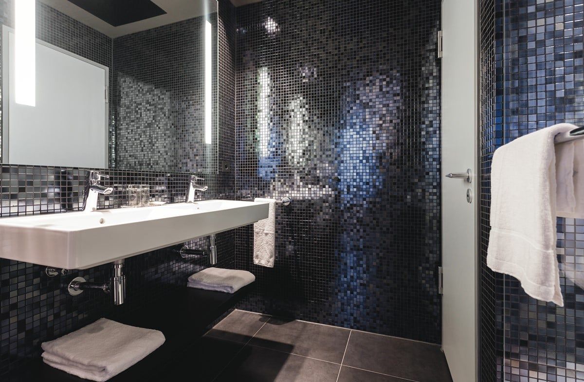 Het is een detail, maar wat voor één! Na een lange wandeling is het heerlijk om met je vermoeide blote voeten op een warme vloer te gaan staan. Geef toe: ook ’s morgens maakt het voor je humeur toch een enorm verschil of je op een kille of een warme vloer je tanden staat te poetsen? De badkamers zijn trouwens voorzien van een regendouche, een gewone douche, of (afhankelijk van je kamertype) een bad. Met hun stijlvolle donkere tegels stralen deze badkamers de luxe uit van een echte spa. Hier kom je helemaal tot rust na een dag vergaderen of shoppen.